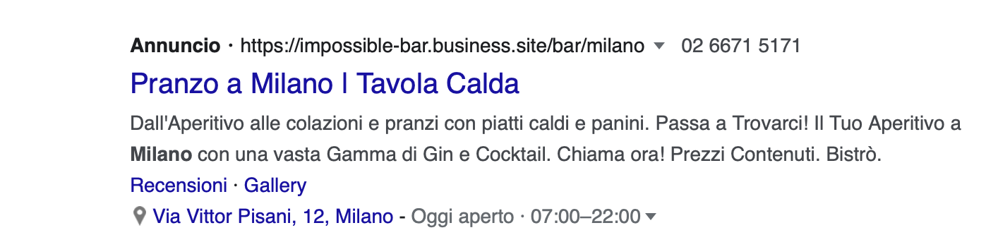 “Grazie all'aggiunta di contenuti, le estensioni garantiscono all'annuncio maggiore visibilità nella pagina dei risultati di ricerca; in altre parole, traggono da esso il massimo profitto. Spesso, le estensioni aumentano il numero totale di clic e possono offrire agli utenti altri modi per raggiungerti, anche interattivi, come le mappe o le chiamate.”